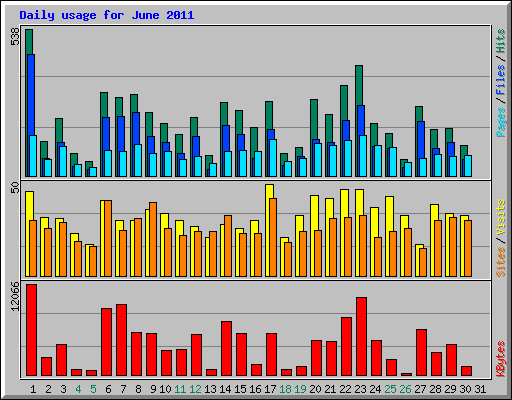 | Day | Hits | Files | Pages | Visits | Sites | KBytes | ||||||